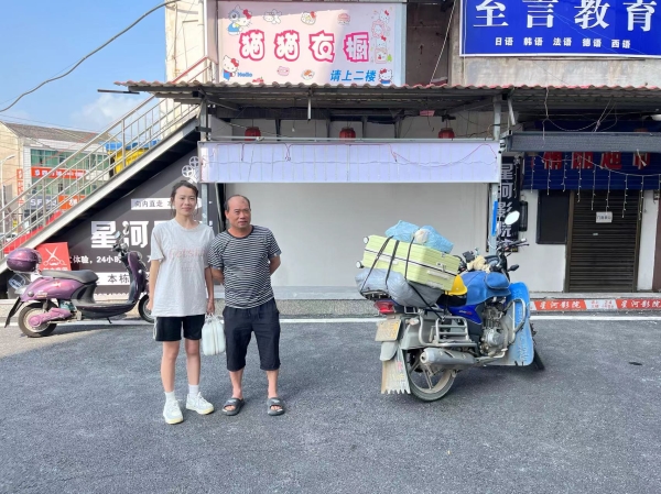 8月30日上午9時,岳潔父女汗流浹背,背著大包小袋來校報到,迎新的老師和學生志愿者無不感動!他們可是凌晨5時出發(fā),父親騎著摩托從130公里外的邵陽送女兒來校報道。
