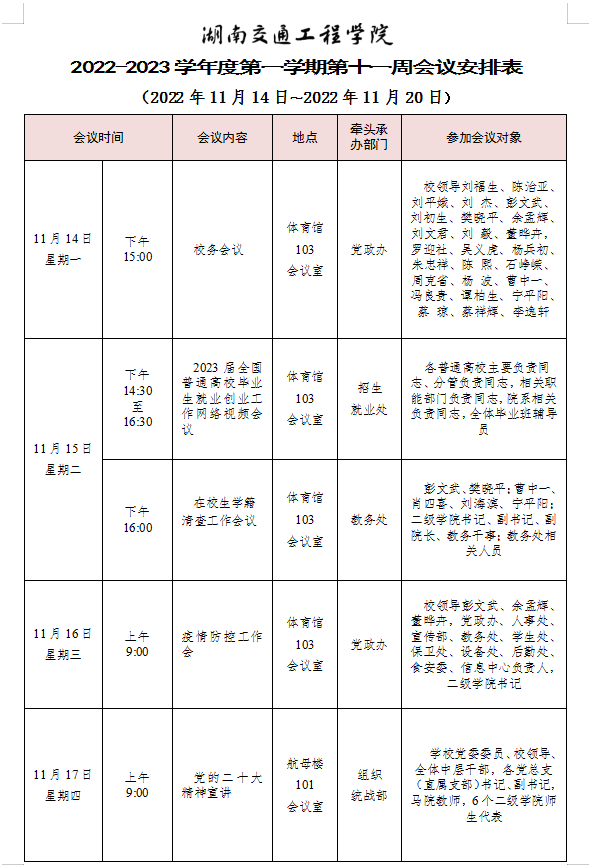 湖南交通工程學(xué)院2022-2023學(xué)年度第一學(xué)期第十一周會(huì)議安排表