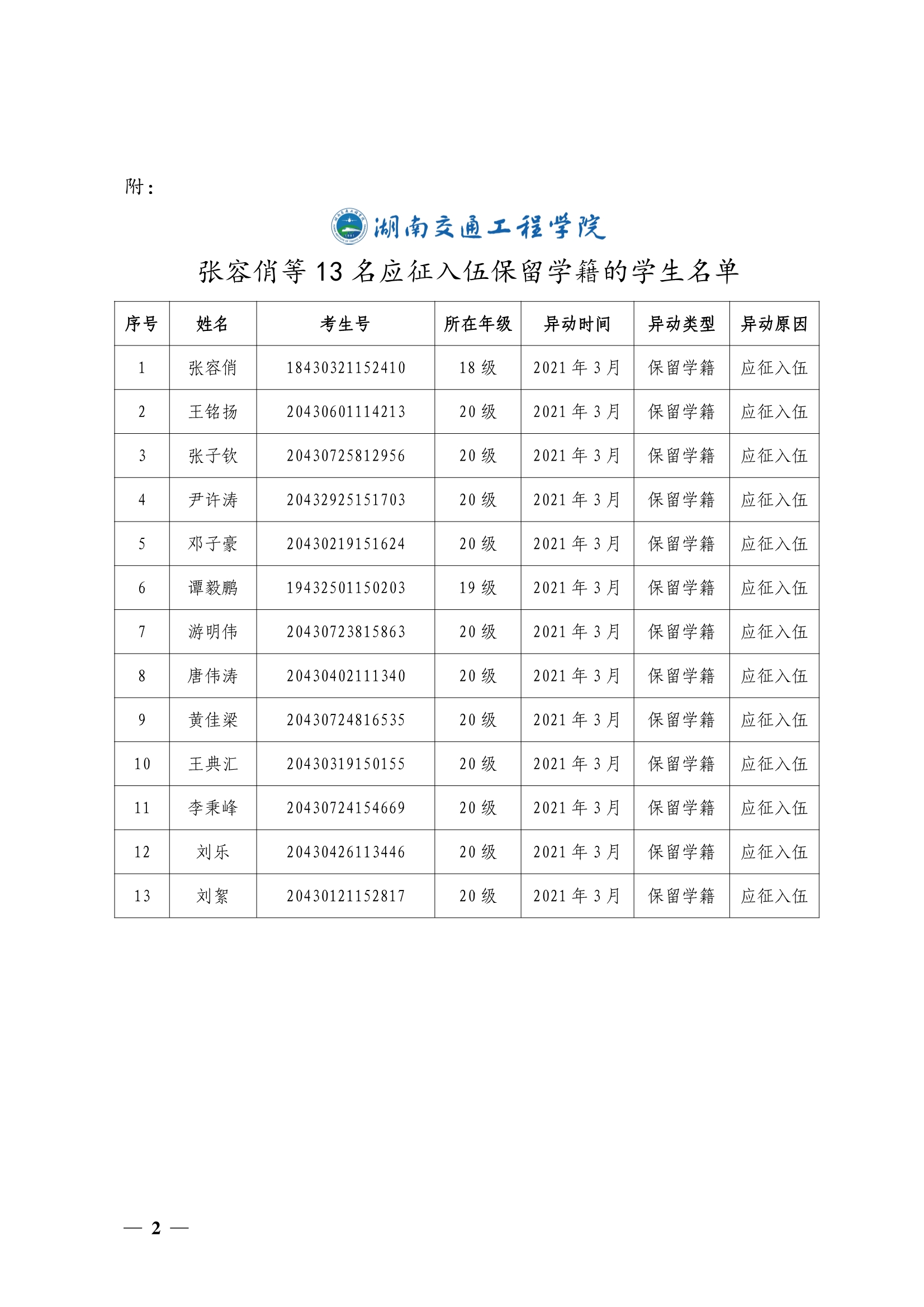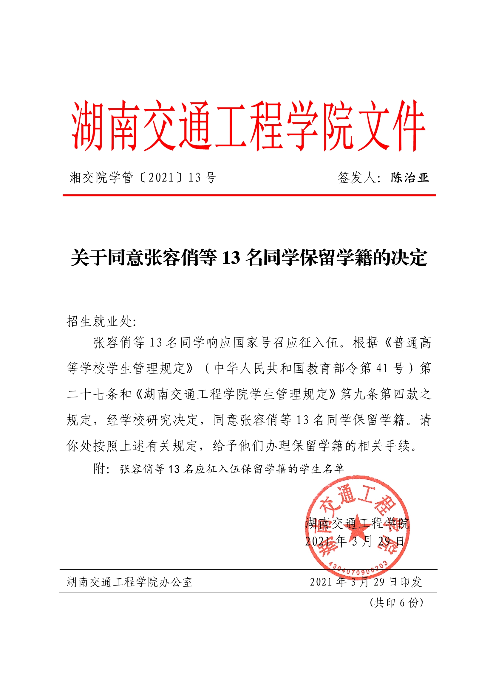 關(guān)于同意張容俏等13名同學(xué)保留學(xué)籍的決定(湘交院學(xué)管〔2021〕13號(hào))