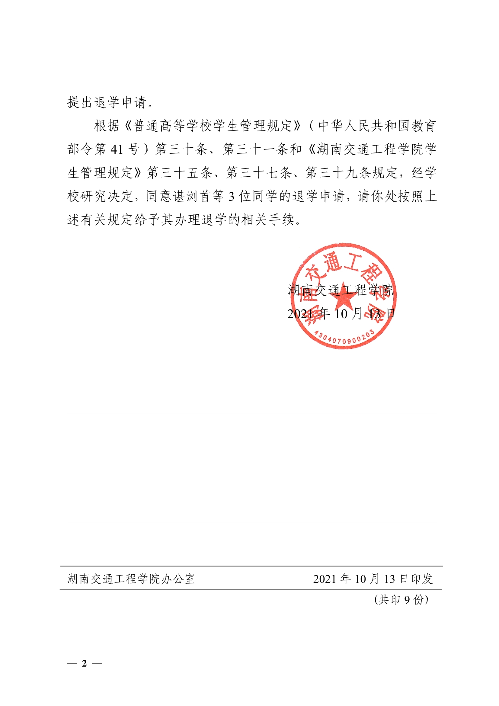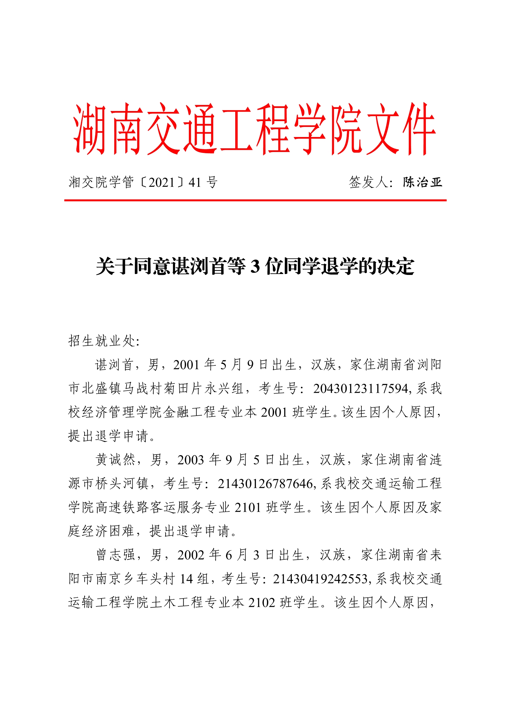 關(guān)于同意諶瀏首等3位同學(xué)退學(xué)的決定(湘交院學(xué)管〔2021〕41號(hào))