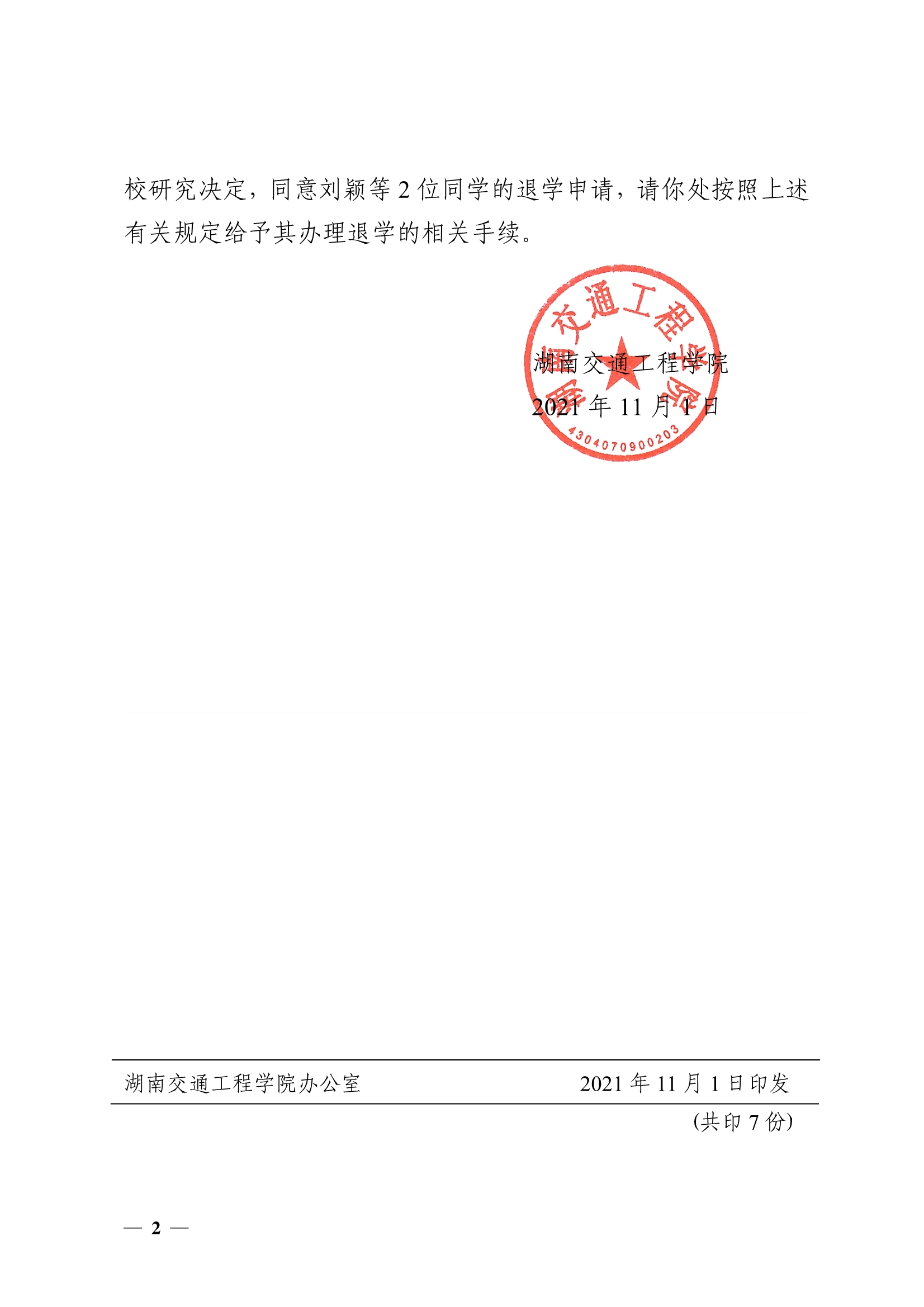 關(guān)于同意劉穎等2位同學(xué)退學(xué)的決定(湘交院學(xué)管〔2021〕44號(hào))