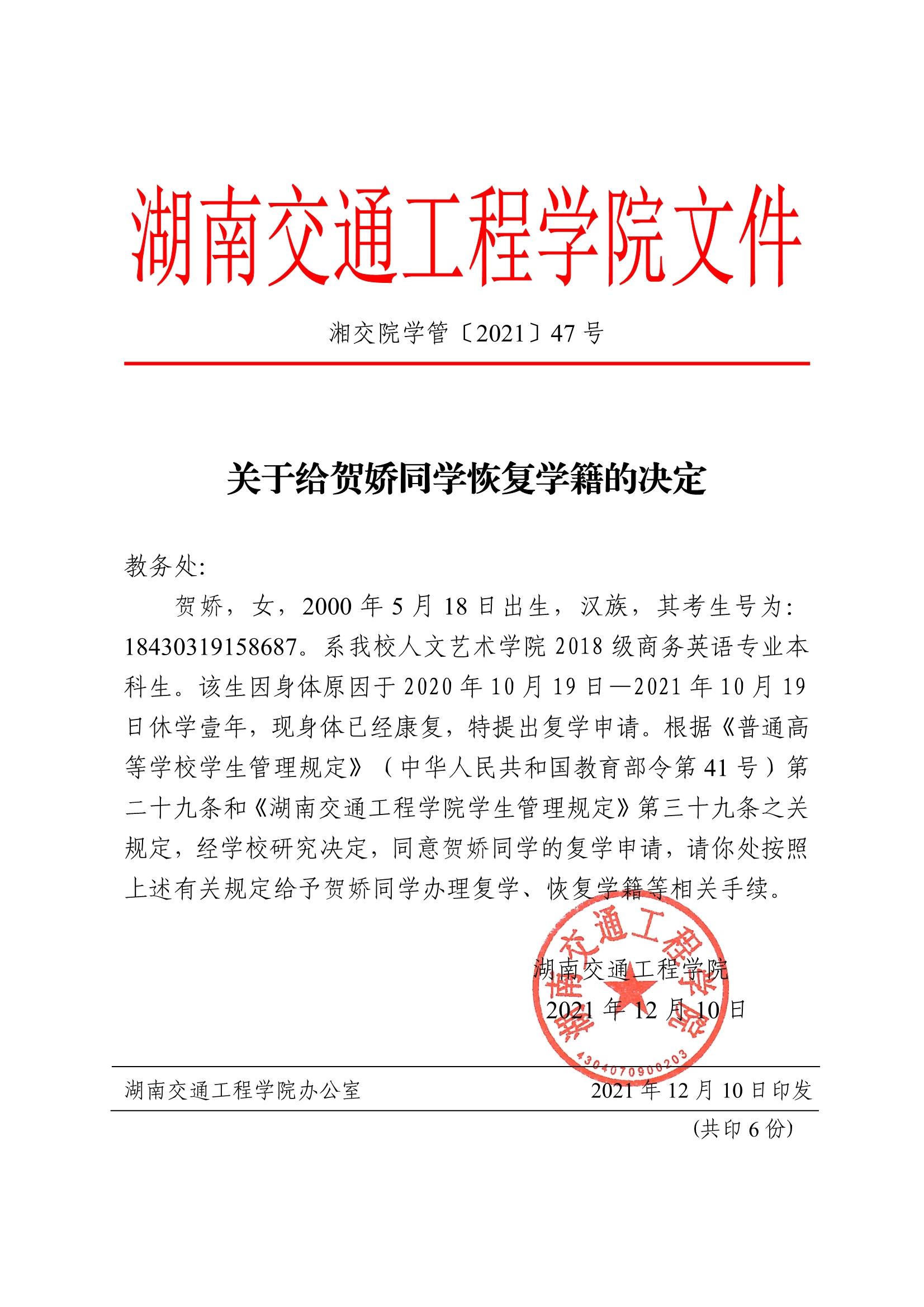 關(guān)于給賀嬌同學(xué)恢復(fù)學(xué)籍的決定(湘交院學(xué)管〔2021〕47號(hào))