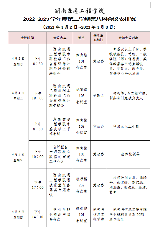 湖南交通工程學(xué)院2022-2023學(xué)年度第二學(xué)期第八周會(huì)議安排表