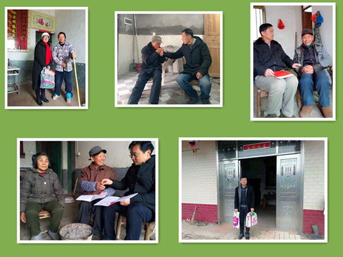 與市直扶貧工作隊(duì)、群峰村干部進(jìn)行簡(jiǎn)短的對(duì)接交流詢問(wèn)座談以后,我校扶貧工作隊(duì)成員馬不停蹄急不可待地分頭直奔8個(gè)結(jié)對(duì)貧困戶,他們一個(gè)個(gè)肩扛精裝大米,手提木耳蘑菇紅棗等,頂著寒風(fēng),冒著冷雨,行走在田間地頭,將黨和政府的溫暖關(guān)愛(ài)及時(shí)送到鄉(xiāng)親們的手里。
