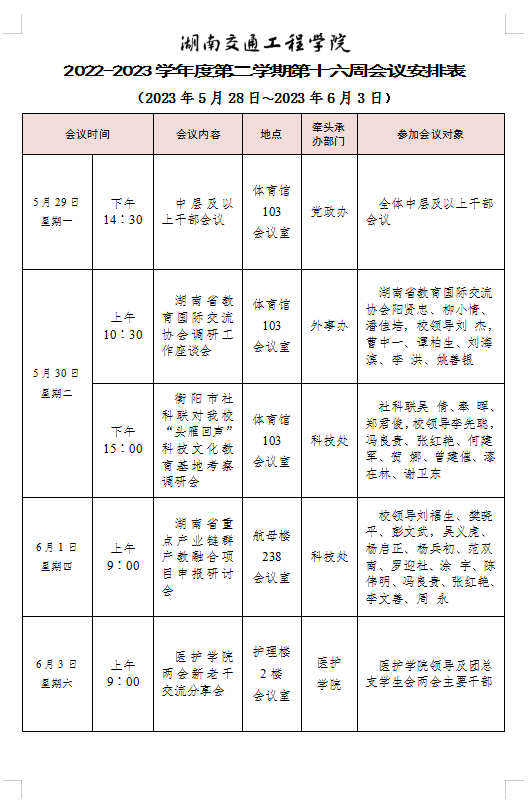 湖南交通工程學院2022-2023學年度第二學期第十六周會議安排表