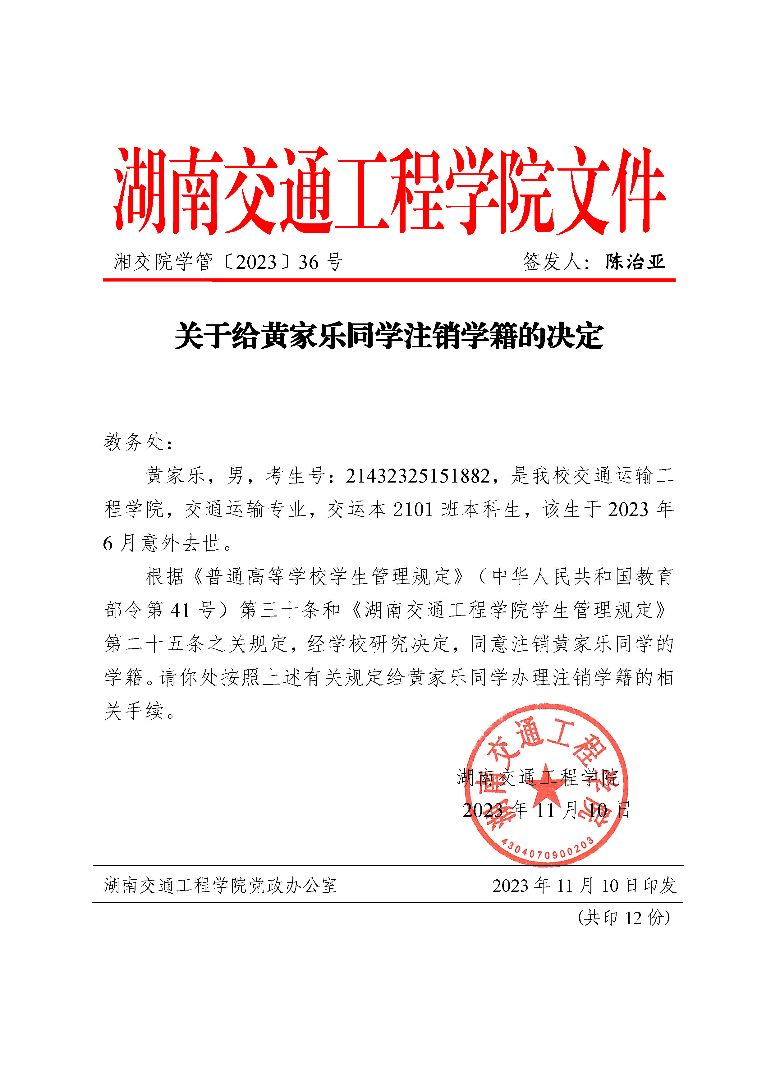 關(guān)于給黃家樂同學(xué)注銷學(xué)籍的決定(湘交院學(xué)管〔2023〕36號)
