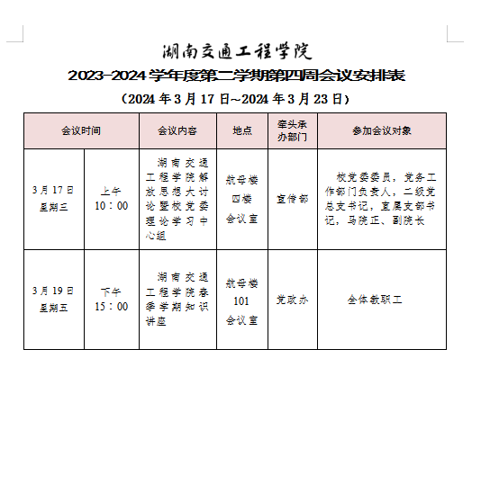 湖南交通工程學(xué)院2023-2024學(xué)年度第二學(xué)期第四周會(huì)議安排表