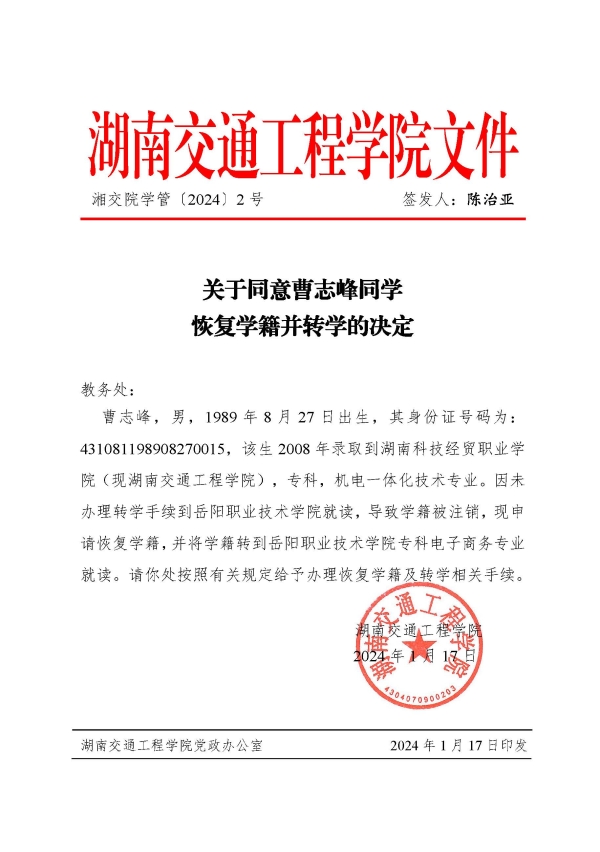 關于同意曹志峰同學恢復學籍并轉學的決定(湘交院學管〔2024〕2號)