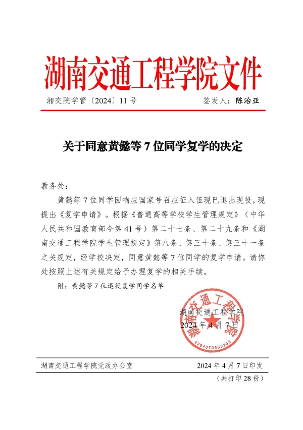 關(guān)于同意黃懿等7位同學(xué)復(fù)學(xué)的決定(湘交院學(xué)管〔2024〕11號)