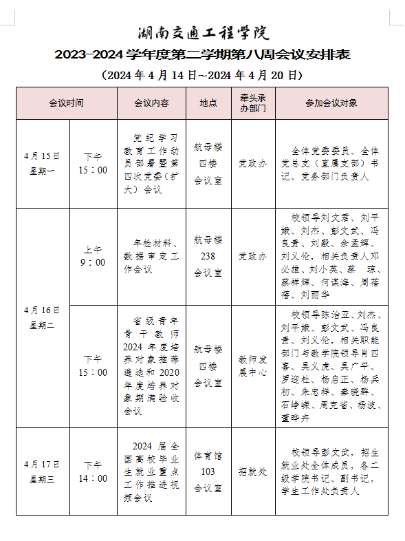 湖南交通工程學(xué)院2023-2024學(xué)年度第二學(xué)期第八周會(huì)議安排表