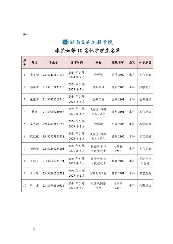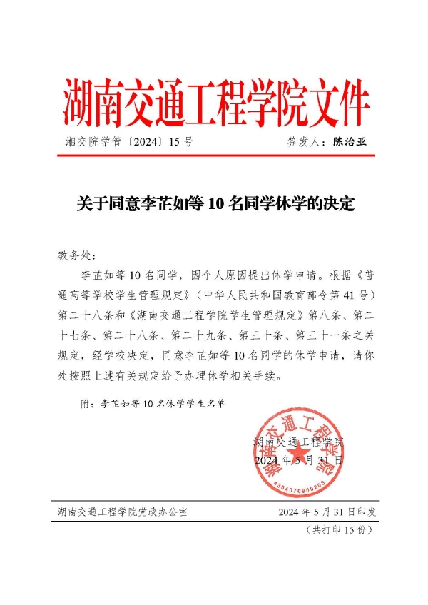 關(guān)于同意李芷如等10名同學休學的決定(湘交院學管〔2024〕15號)