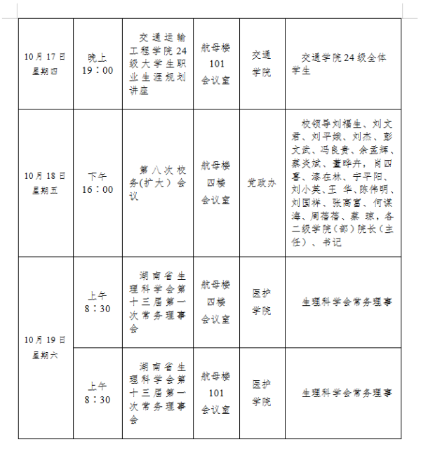 湖南交通工程學(xué)院2024-2025學(xué)年度第一學(xué)期第七周會(huì)議安排表