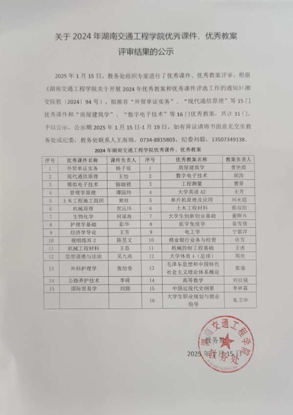 2025年1月15日,教務處組織專家進行了優(yōu)秀課件、優(yōu)秀教案評審,根據(jù)《湖南交通工程學院關(guān)于開展2024年優(yōu)秀教案和優(yōu)秀課件評選工作的通知》(湘交院教〔2024〕94號),擬推薦“外貿(mào)單證實務”、“現(xiàn)代通信原理”等15門優(yōu)秀課件和“房屋建筑學”、“數(shù)字電子技術(shù)”等16門優(yōu)秀教案,共計31門,予以公示。公示期2025年1月15日-1月19日,如有異議請將書面意見交至教務處或紀委,教務處聯(lián)系人王海娥,0734-8815803,紀委劉毅,13507349138。