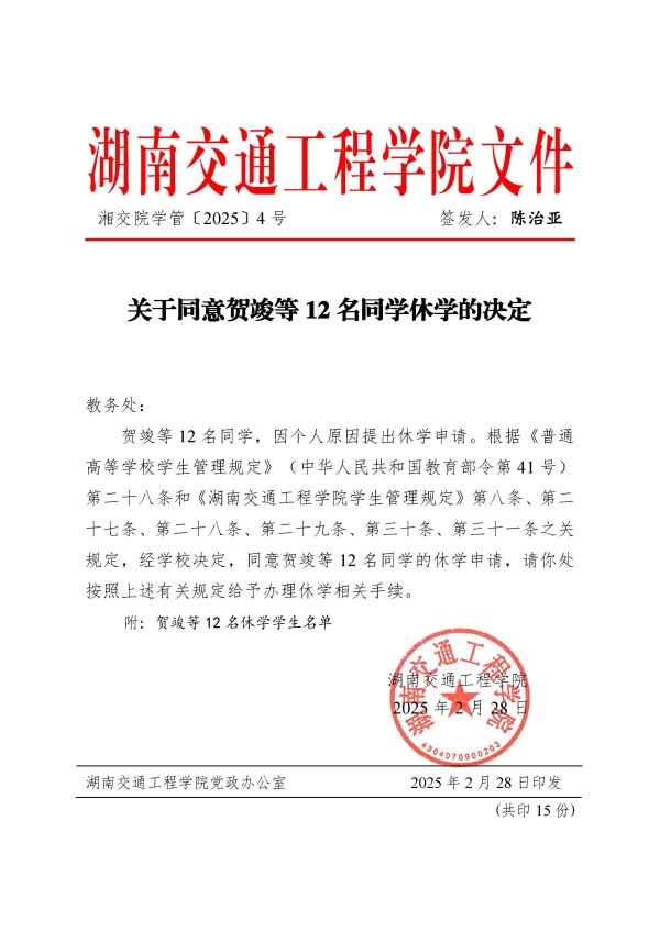 關(guān)于同意賀竣等11名同學(xué)休學(xué)的決定(湘交院學(xué)管〔2025〕4號)