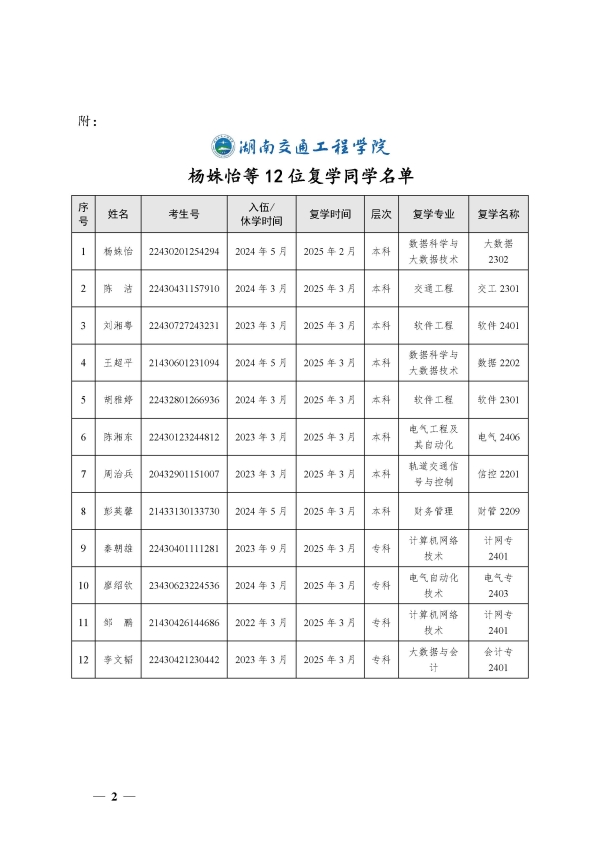 關于同意楊姝怡等12位同學復學的決定(湘交院學管〔2025〕5號)
