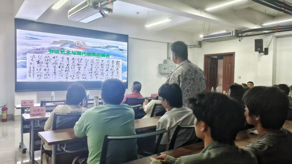 王神箭教授以蘇州博物館的飛檐設(shè)計為例,闡述書法中“行云流水”的線條美學如何轉(zhuǎn)化為建筑輪廓的靈動感。隨后,他面向臺下學生拋出問題:“該書法與該意境相結(jié)合給你一種怎樣的體會?”交通運輸工程學院交運2401班的陳思妤立即舉手回應(yīng):“王老師的案例讓我聯(lián)想到王羲之《蘭亭序》中疏密有致的布局。現(xiàn)代建筑可以借鑒這種‘留白’手法,比如通過開放式庭院或鏤空墻體,在實體結(jié)構(gòu)中創(chuàng)造呼吸感,既保留功能性,又賦予空間文化意境?!蓖踅淌邳c頭贊許,并補充道:“書法不僅是視覺藝術(shù),更是空間與時間的流動記錄。建筑的‘虛’可以體現(xiàn)為公共區(qū)域的靈活分隔,‘實’則通過材質(zhì)與結(jié)構(gòu)傳遞文化厚重感。