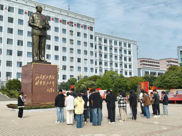 默哀儀式結(jié)束,領(lǐng)導(dǎo)老師和學(xué)生代表邁著沉穩(wěn)的步伐,依次走到毛澤東銅像前,輕輕將手中的鮮花擺放好,以莊重的方式表達(dá)內(nèi)心的敬意。隨后,學(xué)生代表成秋梅走上發(fā)言臺(tái),言辭激昂,每一字、每一句都飽含著對(duì)偉人的敬仰,彰顯出傳承紅色精神的堅(jiān)定決心。緊接著,鄧書記飽含深情地講述革命先烈的奮斗故事,回溯那段血與火交織的歷史。鄧書記的話語如同一股強(qiáng)大的力量,激勵(lì)著在場(chǎng)的每一個(gè)人,以實(shí)際行動(dòng)踐行初心,勇挑時(shí)代賦予的使命 。