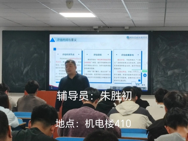 2025年4月6日晚19:00,機(jī)電工程學(xué)院在機(jī)電樓教室組織全體班級(jí)開展“愛校榮校·安全護(hù)航·迎評(píng)攻堅(jiān)”主題班會(huì)。此次班會(huì)由各班級(jí)輔導(dǎo)員擔(dān)任主講,旨在全面部署本科評(píng)估沖刺階段的各項(xiàng)工作,進(jìn)一步凝聚師生力量,助力學(xué)校順利通過本科評(píng)估 。
