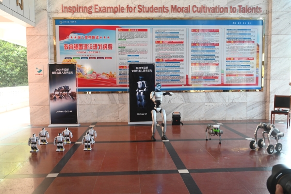 學(xué)生設(shè)計(jì)制作的機(jī)器人、機(jī)械狗等方陣,翩翩起舞歡迎新同學(xué)。