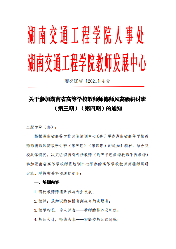 關于參加湖南省高等學校教師師德師風高級研討班(第三期)(第四期)的通知
