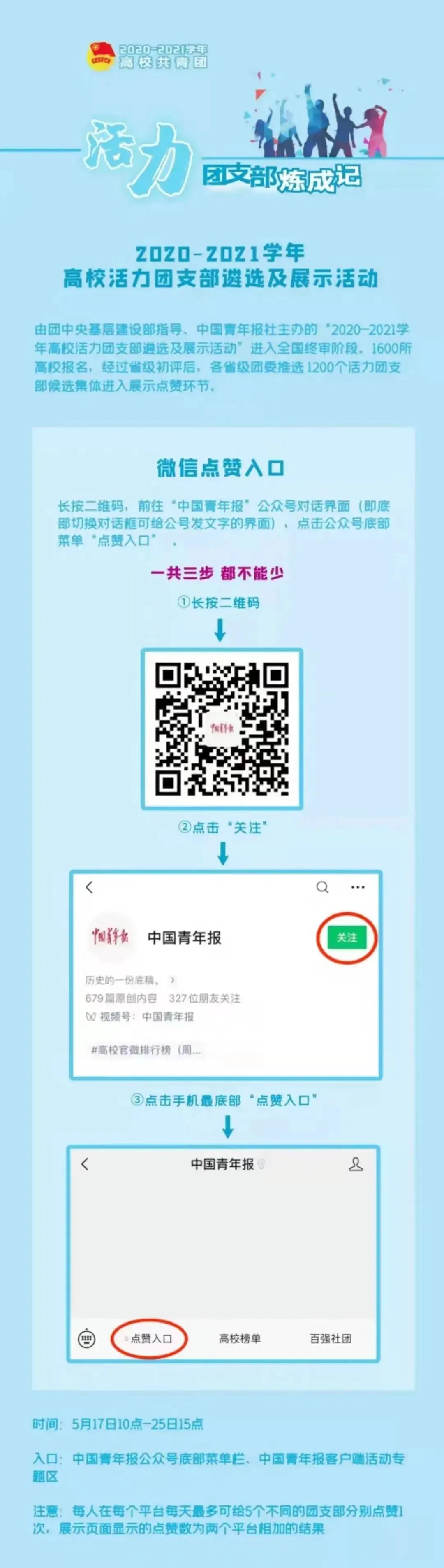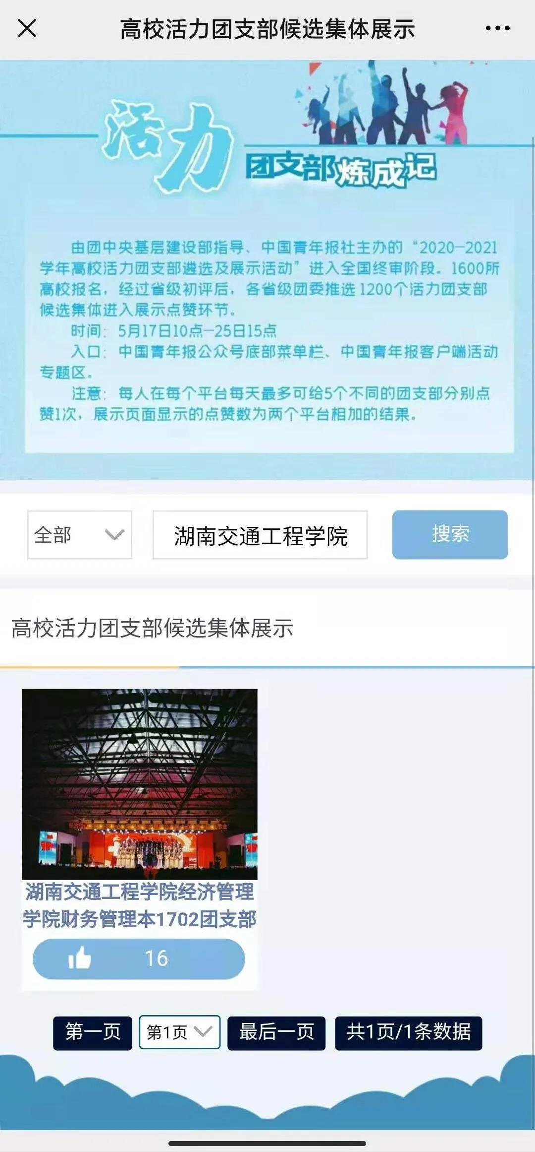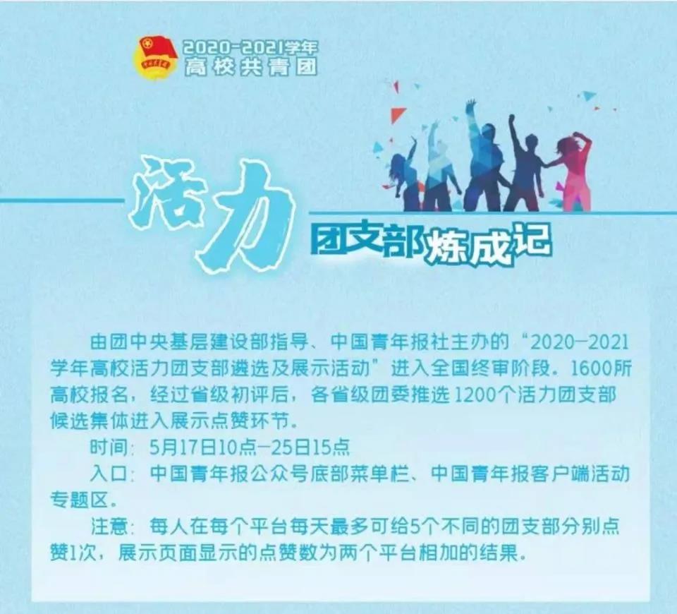 由團(tuán)中央基層建設(shè)部指導(dǎo)、中國青年報(bào)社主辦的“2020-2021學(xué)年高?;盍F(tuán)支部遴選及展示活動(dòng)”進(jìn)入全國終審階段。1600所高校報(bào)名,經(jīng)過省級(jí)初評(píng)后,各省級(jí)團(tuán)委推選1200個(gè)活力團(tuán)支部候選集體進(jìn)入展示點(diǎn)贊環(huán)節(jié)。