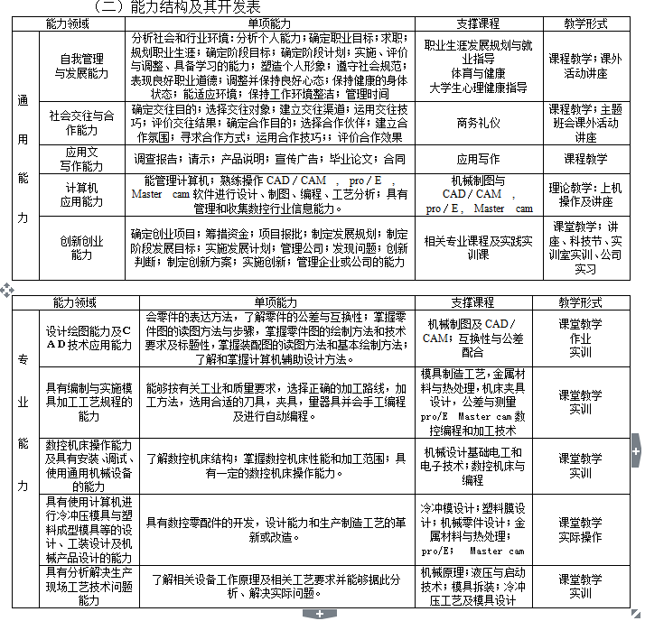 本專業(yè)培養(yǎng)德、智、體全面發(fā)展,掌握模具設(shè)計(jì)與制造專業(yè)必備的基礎(chǔ)理論知識(shí)和專門知識(shí),掌握模具設(shè)計(jì)及制造技術(shù),具有較強(qiáng)實(shí)際操作能力的高等技術(shù)應(yīng)用型專門人才。具有制訂模具成型工藝的能力;具有模具設(shè)計(jì)的能力;具有模具制造的實(shí)際操作技能;具有對(duì)模具及成型設(shè)備的調(diào)試、維護(hù)及故障分析能力;具有模具新工藝、新技術(shù)和新設(shè)備的接受及應(yīng)用能力;熟練掌握模具CAD/CAM技術(shù)。